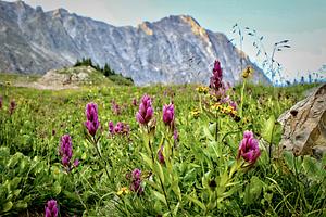 Pink paintbrush wildflowers growing at the base of Capitol Lake near 11,600ft in high alpine of Colorado!