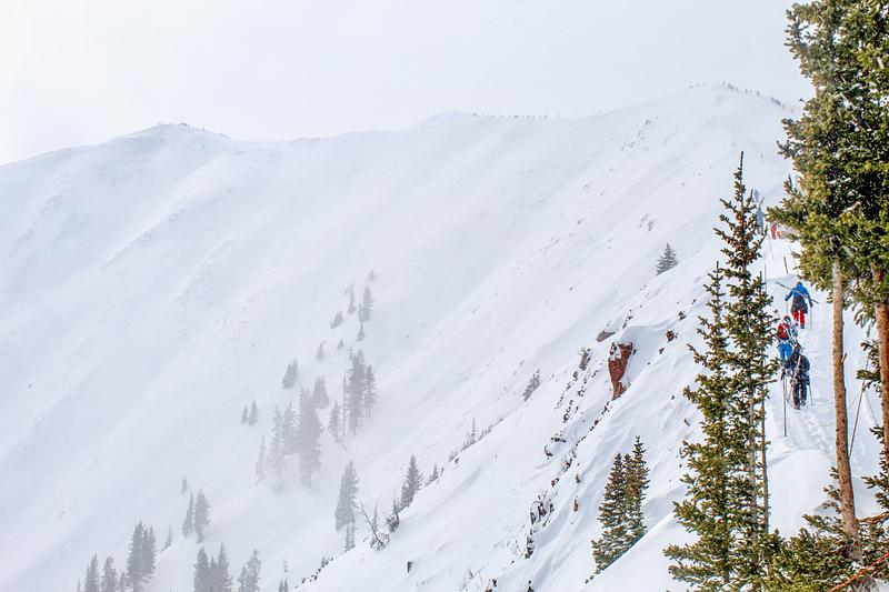 Hiking up Aspen Highlands bowl in January 2022 on a powder day.